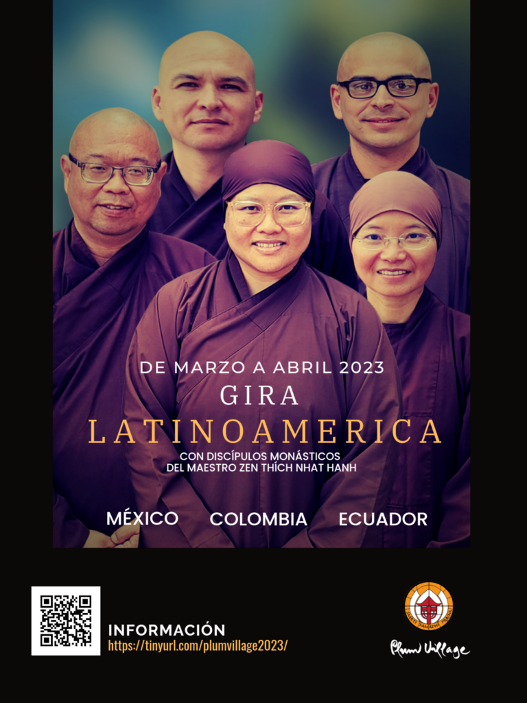 Estamos muy felices y nos sentimos muy honrados de ser invitados por sanghas locales en México, Colombia, Ecuador, Brasil, Argentina y Chile para compartir nuestra práctica en estos países, con muchas personas de corazón abierto y sanghas locales en marzo y abril de 2023.